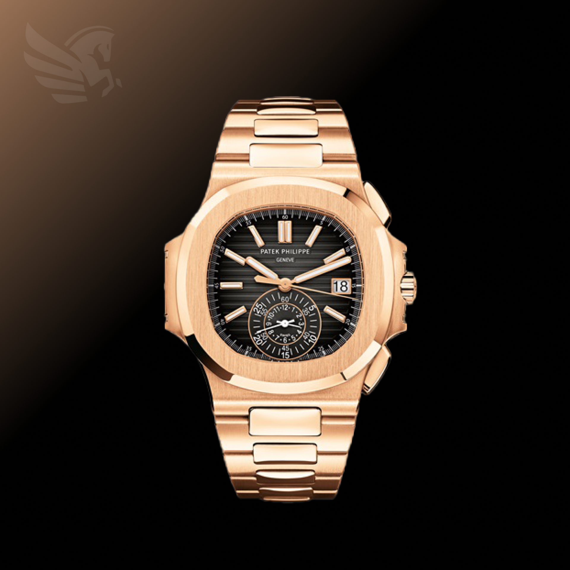 The Patek Philippe Nautilus Chronograph 5980R-001 is a stunning timepiece that combines the sporty design of the Nautilus collection with the complexity of a chronograph. The watch features a 40.5mm rose gold case with a black gradient dial and luminescent hands and hour markers. The chronograph sub-dials are located at 6 and 9 o'clock, while a date window is positioned at 3 o'clock. The watch is powered by the automatic caliber CH 28-520 C, which has a power reserve of up to 55 hours. The case is water-resistant up to 120 meters and features a screw-down crown and pushers. The watch is completed with a matching rose gold bracelet.